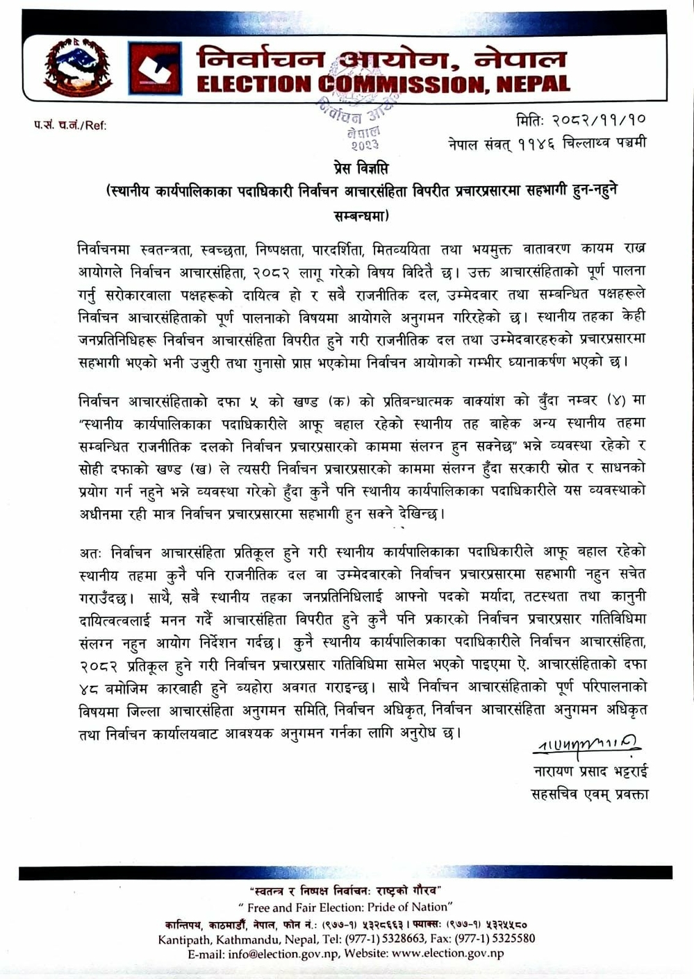 काठमाडौँ । निर्वाचन आयोग ले स्थानीय कार्यपालिका पदाधिकारीलाई निर्वाचन आचारसंहिताविपरीत प्रचारप्रसारमा संलग्न नहुन निर्देशन जारी गरेको छ । आयोगका प्रवक्ता नारायणप्रसाद भट्टराई ले विज्ञप्ति जारी गर्दै निर्वाचन आचारसंहिताको दफा ५ कडाइका साथ पालना गर्न आग्रह गरेका छन् । आयोगले सार्वजनिक पदमा..
