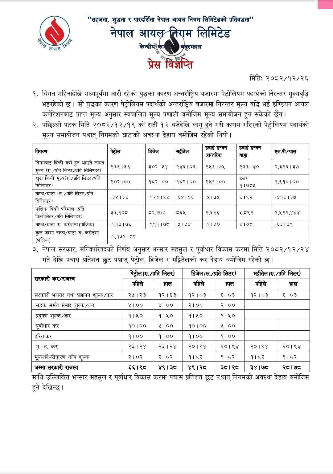 काठमाडौँ । नेपाल आयल निगम ले पेट्रोलियम पदार्थको मूल्य पुनः वृद्धि गरेको छ। अन्तरराष्ट्रिय बजारमा पेट्रोलियम पदार्थको मूल्यमा भइरहेको उतारचढावका कारण मूल्य समायोजन गर्नुपरेको निगमले..