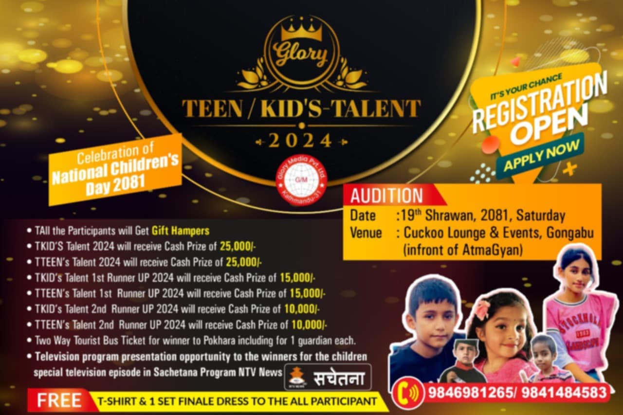 ग्लोरी टिन एण्ड किड्स ट्यालेण्ट्सको प्रथम अडिसन साउन १९ मा गंगबुँ आत्मज्ञान स्थित कुक्कुमा हुने