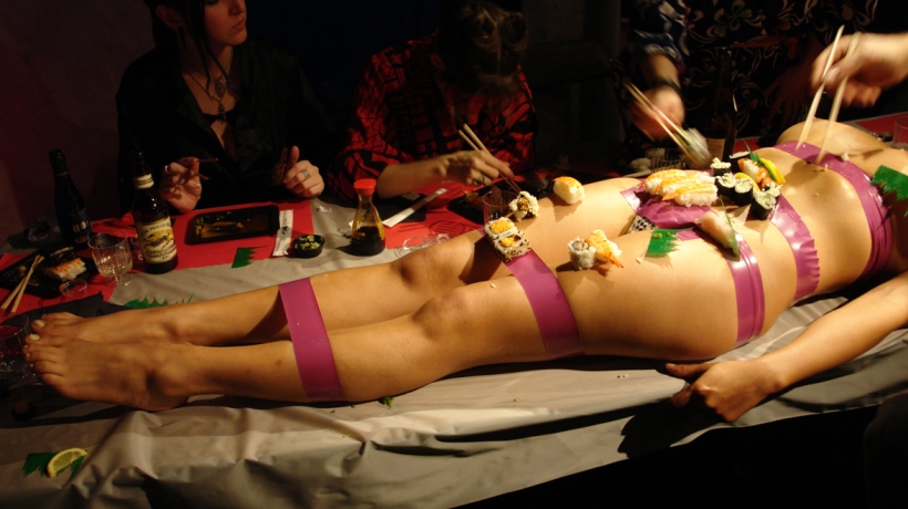 नग्न युवतीको शरीरमा खाना पस्किने अचम्मको रेष्टुरेन्ट, प्लेट बनेर बसेकी युवतीको शरीरबाट खाना खान मानिसहरुको लाइन