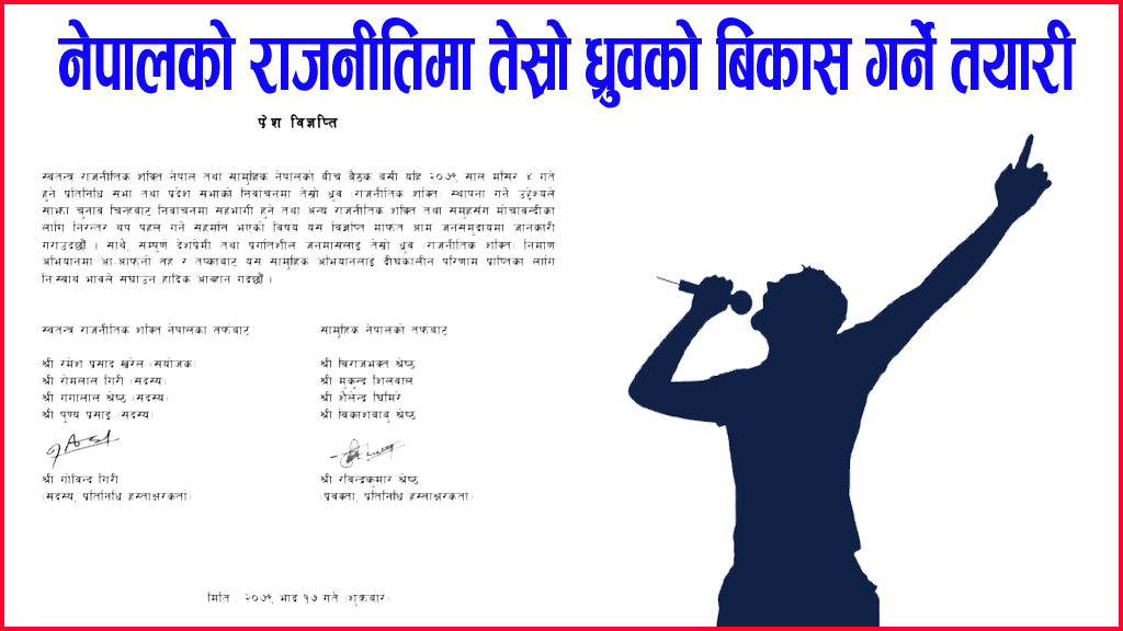 तेस्रो राजनैतिक धार निर्माण गर्न रमेश खरेल ,पुण्य प्रसाईँ , बिराज भक्त श्रेष्ठ,रोमलााल गिरी , गंगालाल श्रेष्ठ , मुकुन्द सिलवाल , बिकास बाबु श्रेष्ठ ,शैलेन्द्र घिमिरे लगायतको आजको बैठकमा ऐकेबद्धता रहेको थियो ।