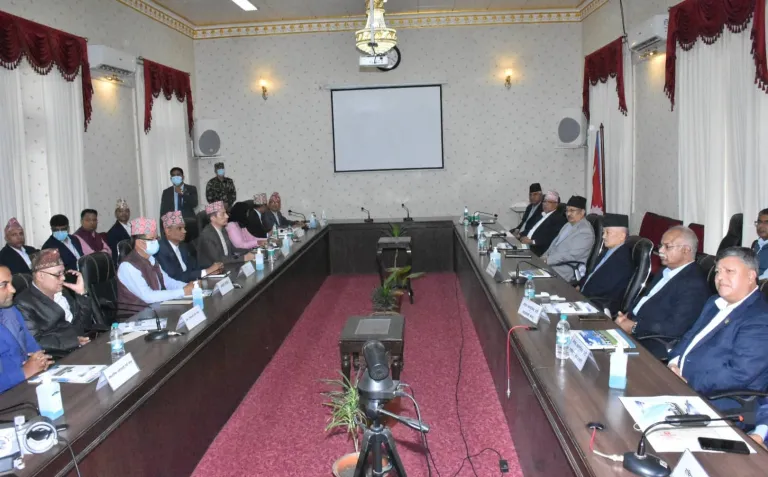 आयोगको कार्यालयमा भर्खरै सुरु भएको छलफलमा प्रधानमन्त्री शेरबहादुर देउवा, गृहमन्त्री बालकृष्ण खाँण, नेकपा एकीकृत समाजवादीका अध्यक्ष माधव कुमार नेपाल लगायत आयोगले निमन्त्रणा गरेका सवै राजनीतिक दलका नेता तथा पदाधिकारी उपस्थित भएका छन् ।