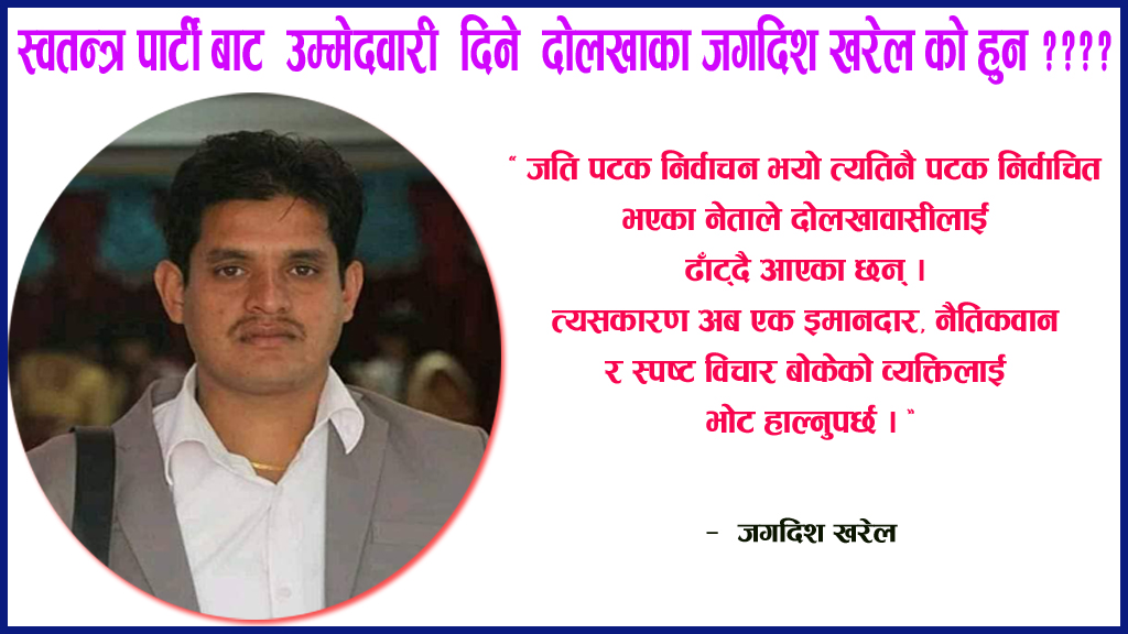 काठमाडौँ । आगामी मङ्सिर ४ मा हुने प्रतिनिधि सभाको निर्वाचनमा राष्ट्रिय स्वतन्त्र पार्टी दोलखाको तर्फबाट इन्जिनियर जगदिश खरेलले उम्मेदवारी दिएका छन् । लामो समय समाजसेवा लगायत व्यवसायमा समेत तल्लीन रहेका खरेलले राष्ट्रिय स्वतन्त्र पार्टीबाट उम्मेदवार दिएका हुन् ।