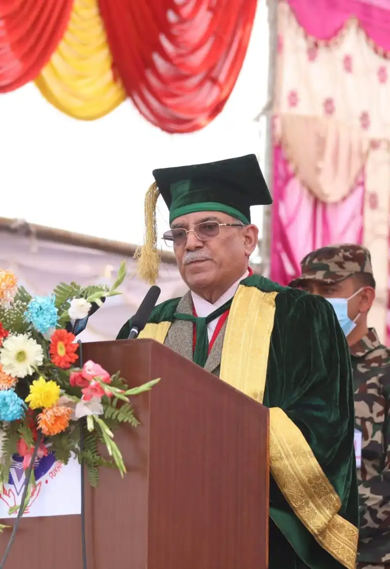 ‘विश्वबजारमा प्रतिस्पर्धी र अब्बल प्रमाणित गर्न तपाईंहरूबीच चुनौतीका चाङ भए पनि धैर्य, संयमित र दूरदर्शी भएर पोखरा विश्वविद्यालयलगायत मुलुककै प्रतिष्ठा उँचो राख्नुहुनेछ भन्ने आशा र विश्वास मैले राखेको छु। विभिन्न कारणले विदेश पलायन हुने जनशक्तिलाई रोजगारी र सीपका माध्यमले स्वदेशमै बस्न सक्ने वातावरण निर्माण गर्ने महत्वपूर्ण अभिभारा तपाईहरूको काँधमा पनि छ,’ प्रधानमन्त्री प्रचण्डले भने ।