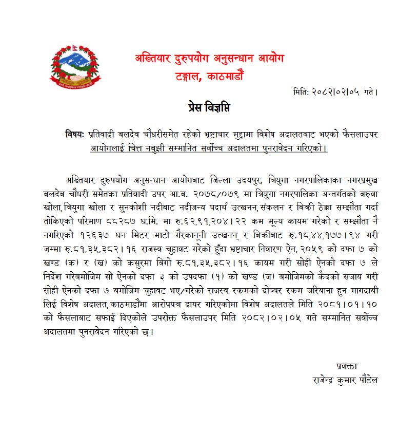 उदयपुरको त्रियुगा नगरपालिकाका नगरप्रमुख बलदेव चौधरीविरुद्धको भ्रष्टाचार मुद्दामा विशेष अदालतबाट भएको फैसलाउपर आयोगलाई चित्त नबुझी सर्वोच्च अदालतमा पुनरावेदन गरिएको प्रवक्ता राजेन्द्र कुमार पौडेलले जानकारी दिए ।