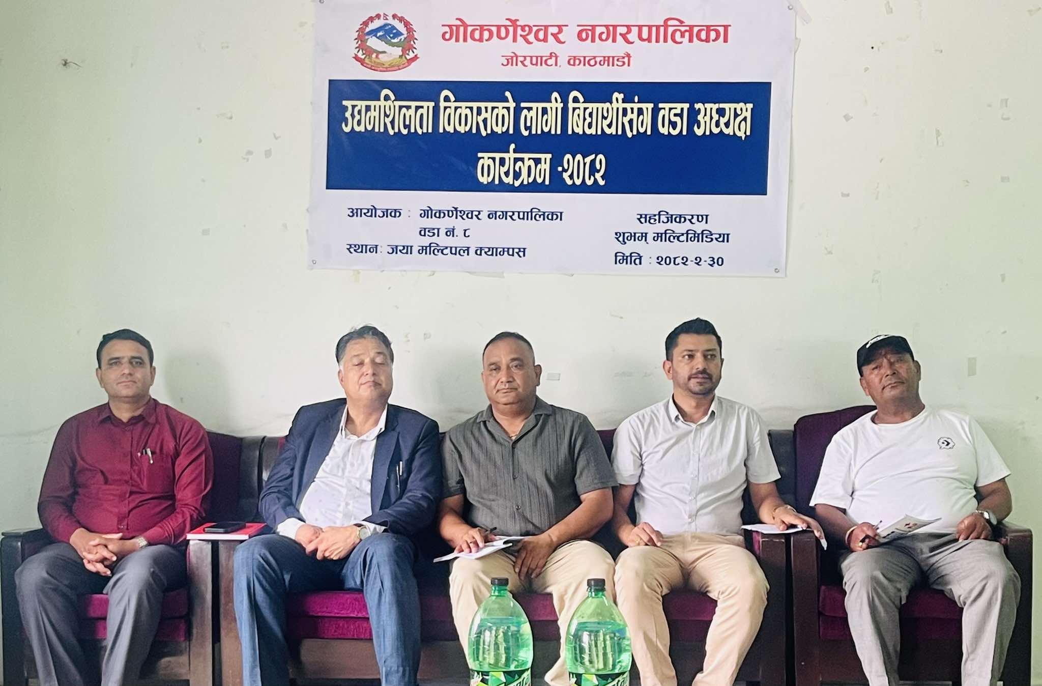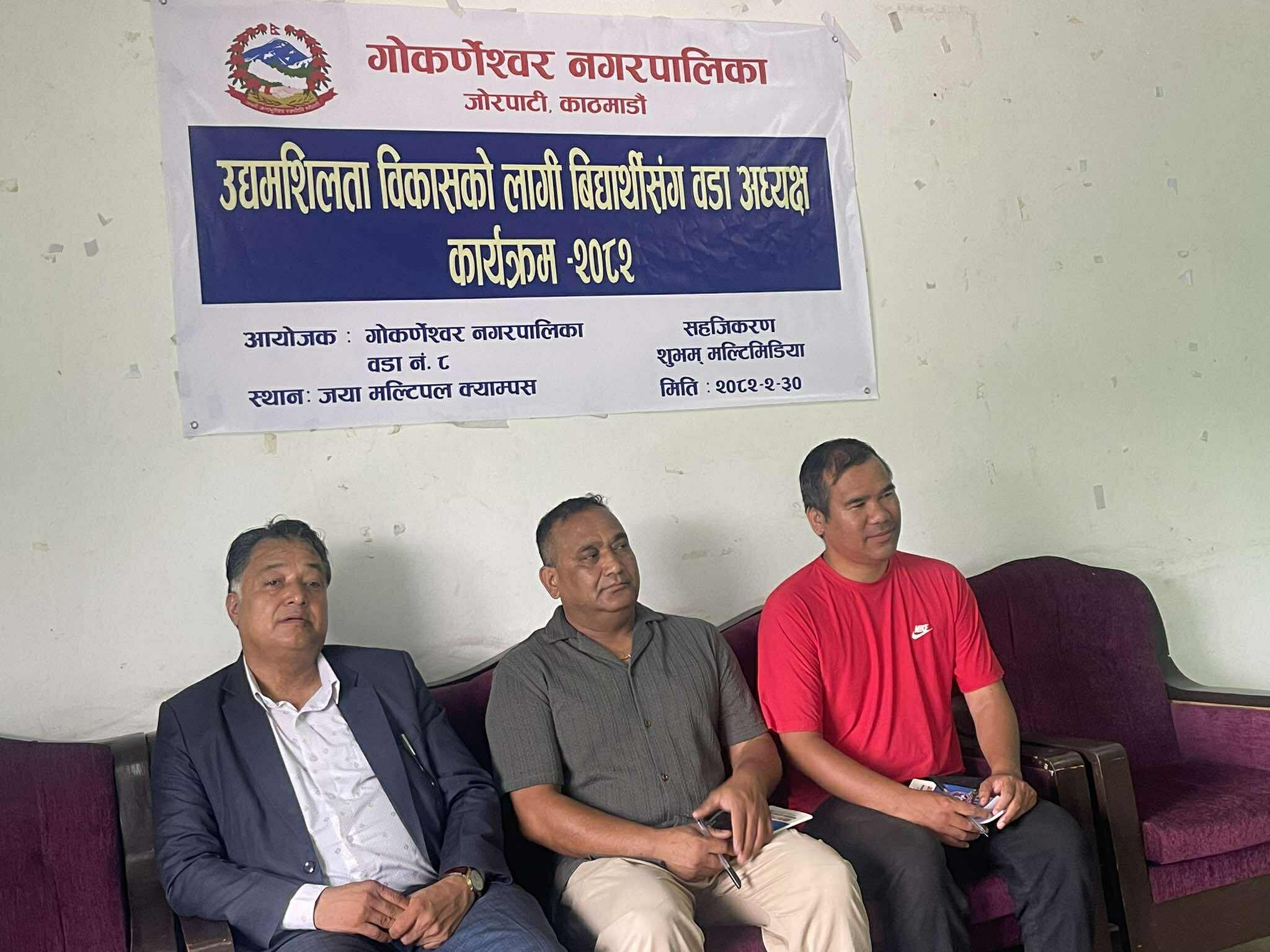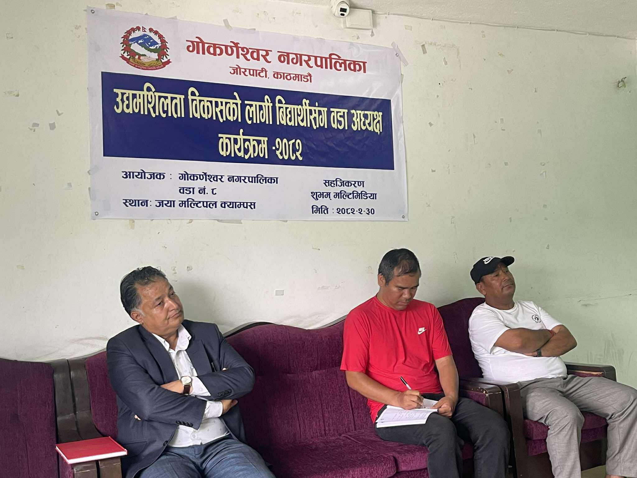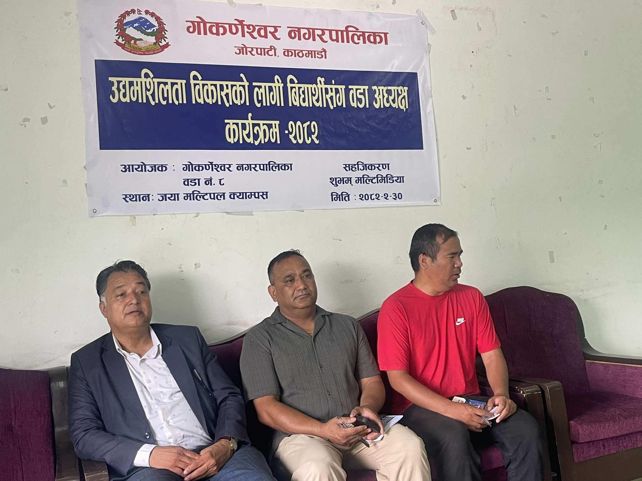 काठमाडौँ । गोकर्णेश्वर नगरपालिका वडा नं. ८ को आयोजना र शुभम मल्टिमिडियाको सहजीकरणमा उद्यमशिलता बिकासको लागि बिद्यार्थीसंग वडा अध्यक्ष कार्यक्रम सम्पन्न भएको छ।