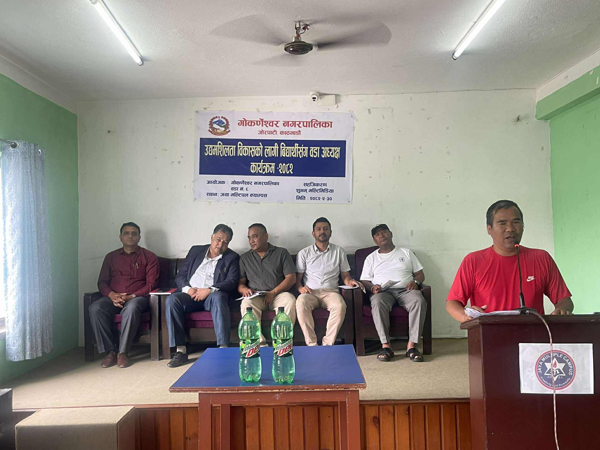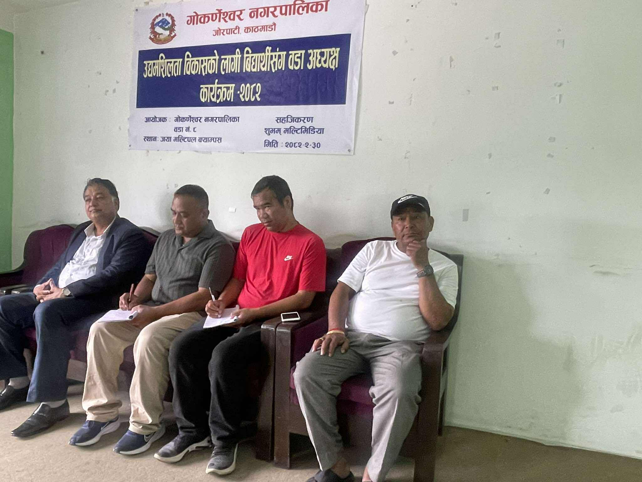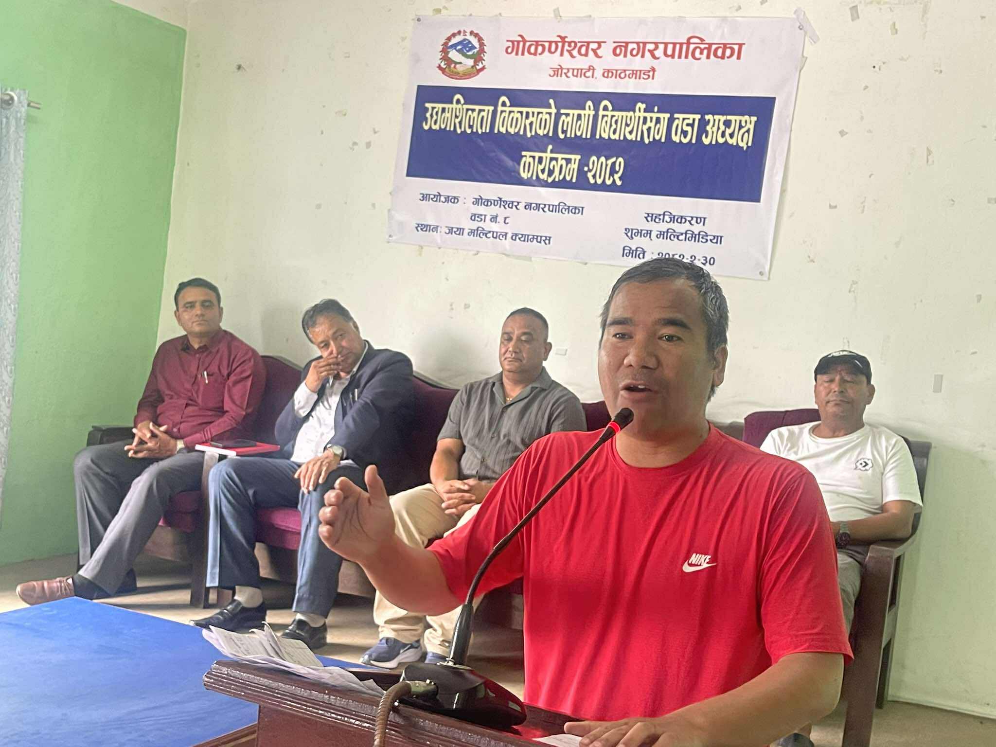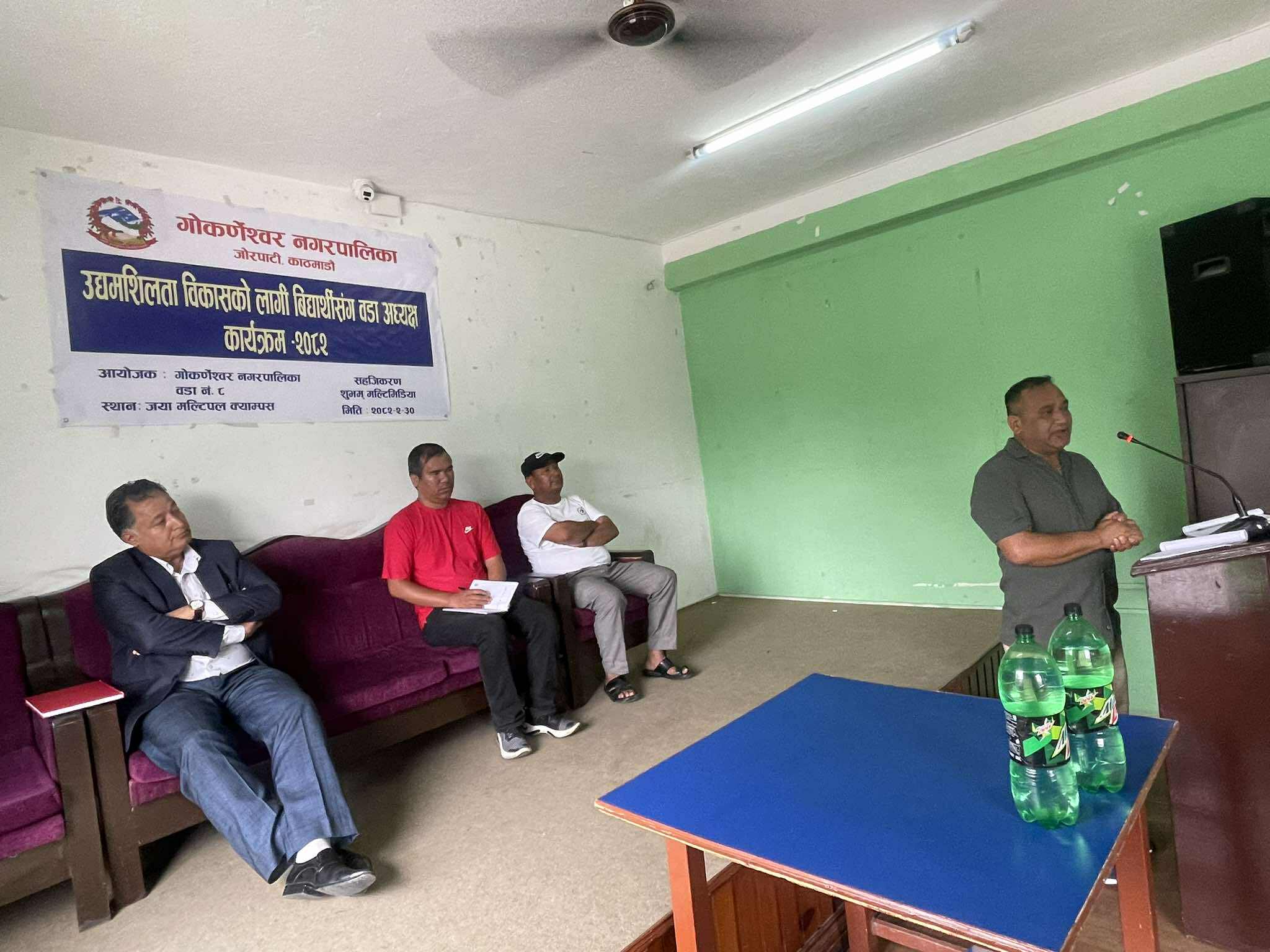 काठमाडौँ । गोकर्णेश्वर नगरपालिका वडा नं. ८ को आयोजना र शुभम मल्टिमिडियाको सहजीकरणमा उद्यमशिलता बिकासको लागि बिद्यार्थीसंग वडा अध्यक्ष कार्यक्रम सम्पन्न भएको छ।