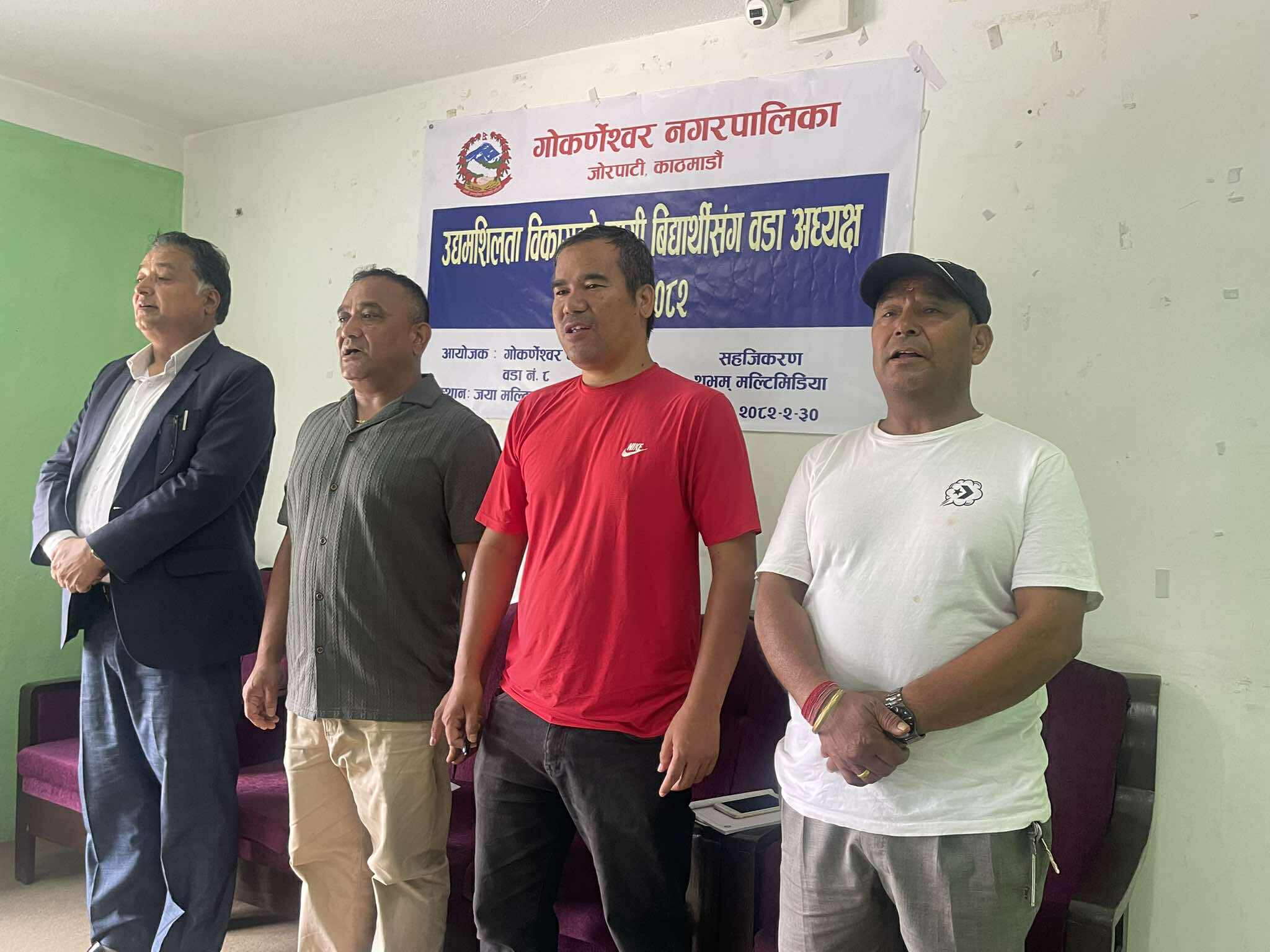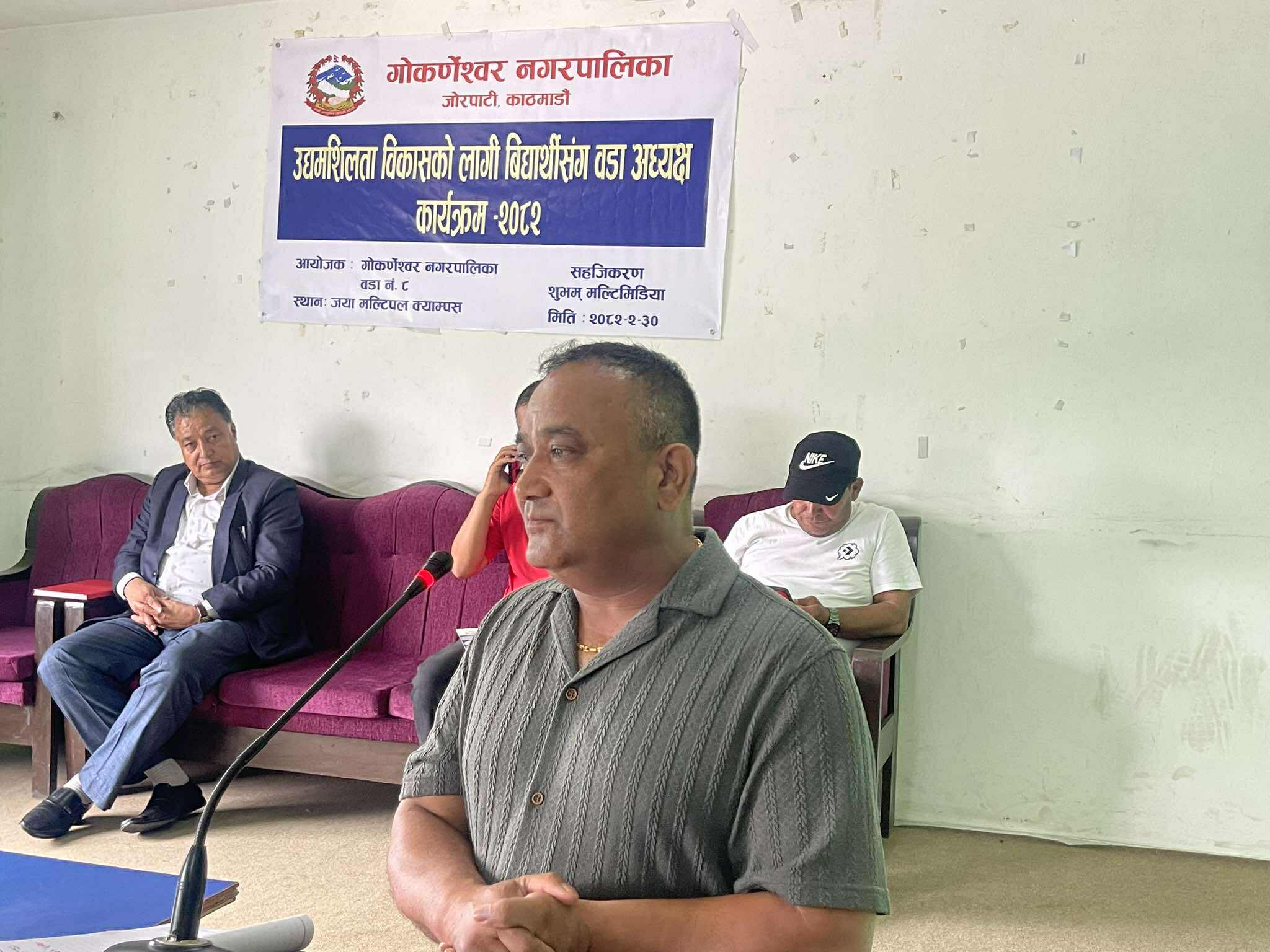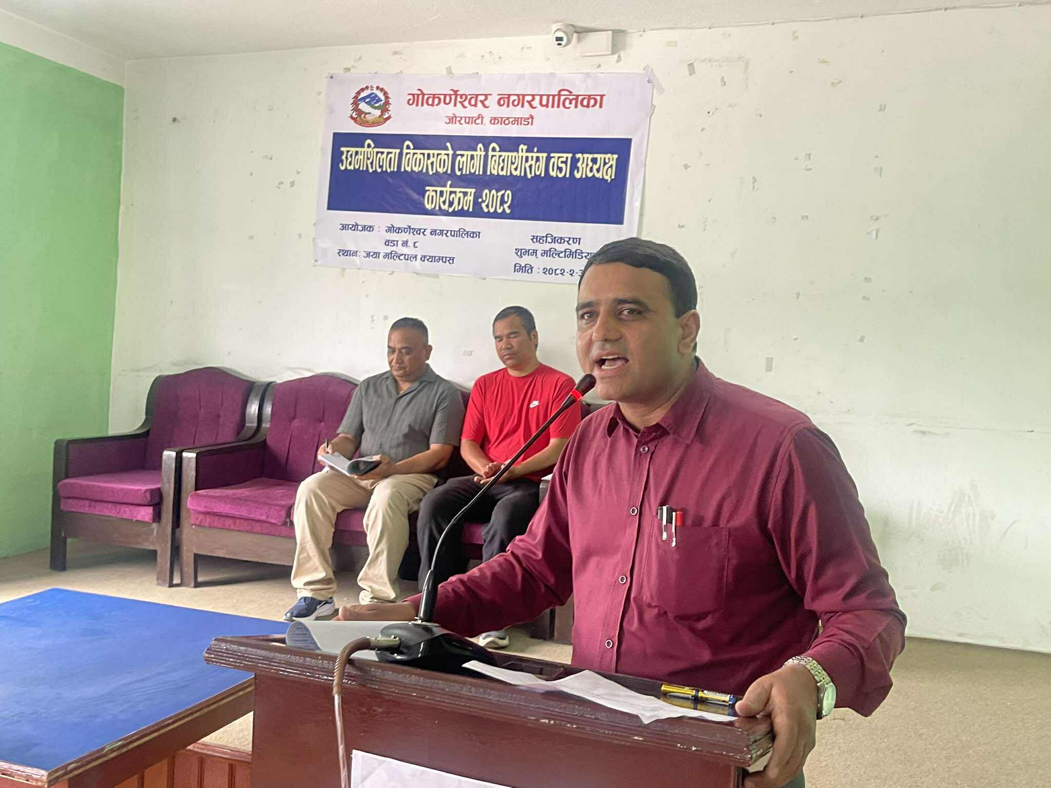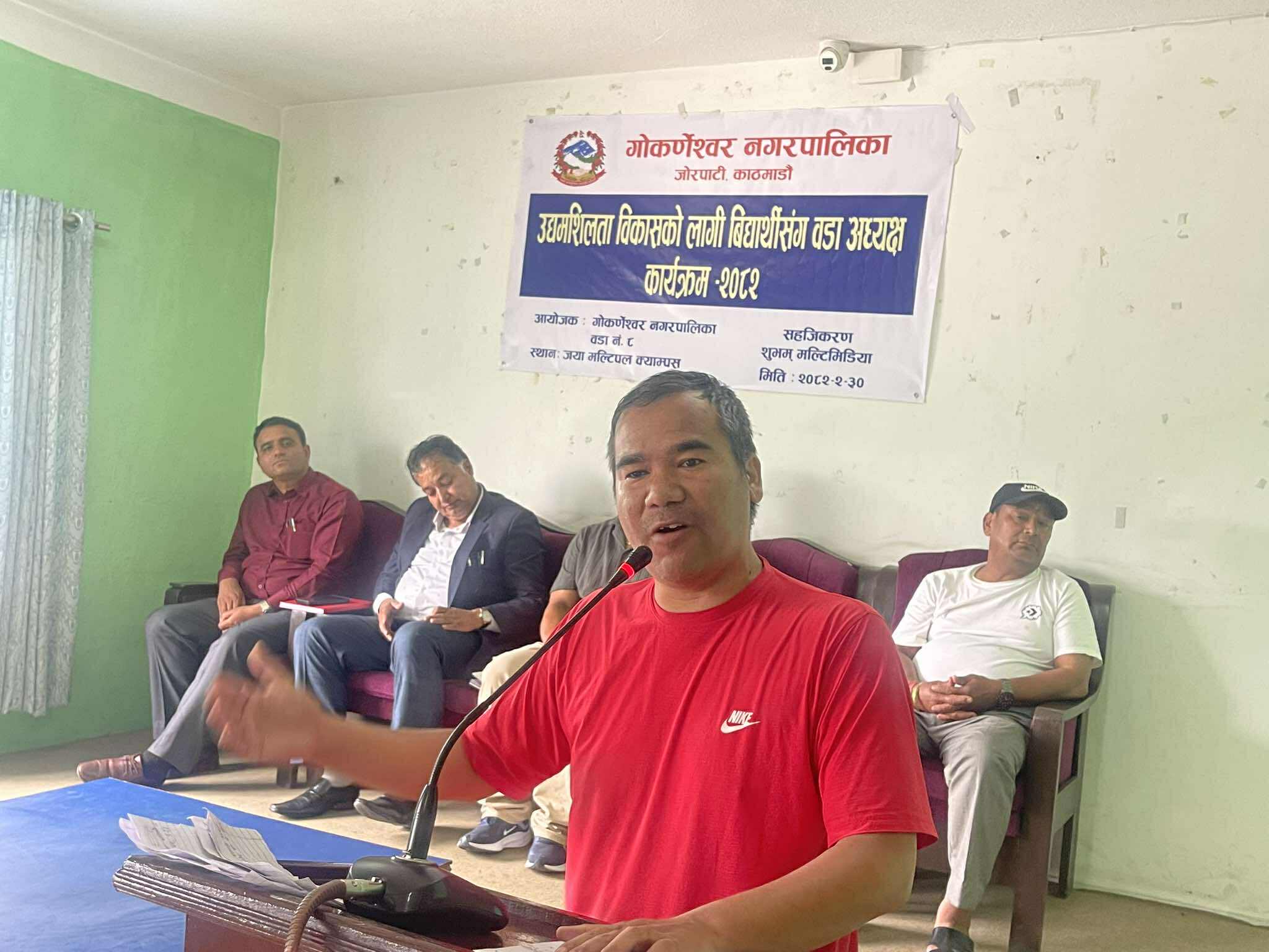 काठमाडौँ । गोकर्णेश्वर नगरपालिका वडा नं. ८ को आयोजना र शुभम मल्टिमिडियाको सहजीकरणमा उद्यमशिलता बिकासको लागि बिद्यार्थीसंग वडा अध्यक्ष कार्यक्रम सम्पन्न भएको छ।