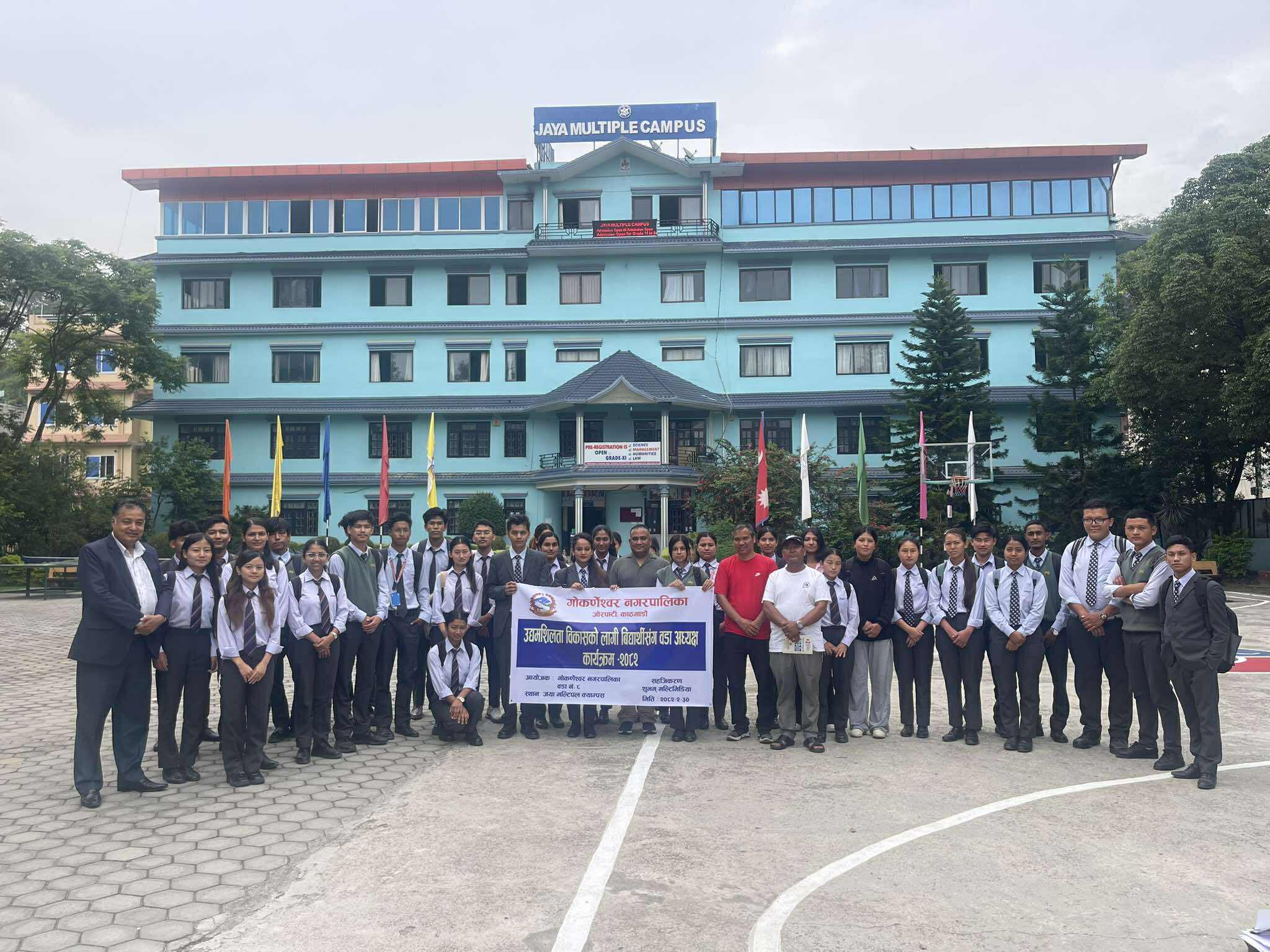 जेठ ३० गते शुक्रबार जया मल्टिपल क्याम्पसको सभाहलमा १५० जना विद्यार्थीहरुको सहभागितामा कार्यक्रम सम्पन्न भएको हो । कार्यक्रम वडा अध्यक्ष नन्दलाल श्रेष्ठको प्रमुख आतिथ्यमा वडा सदस्य सुमन लामाको सभाअध्यक्षमा भएको कार्यक्रममा वडा सदस्य चन्द्रलाल श्रेष्ठ, जया मल्टिपल क्याम्पसका प्रधानाध्यापक भवानी प्रसाद पौडेल,पत्रकार मुकुन्द ढुंगाना,शिक्षक र विद्यार्थीको सहभागिता रहेको थियो ।