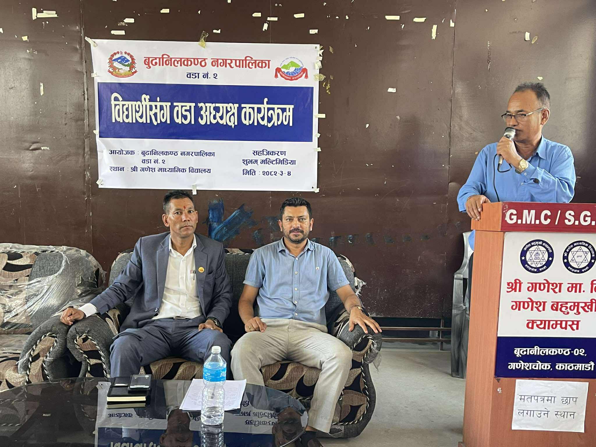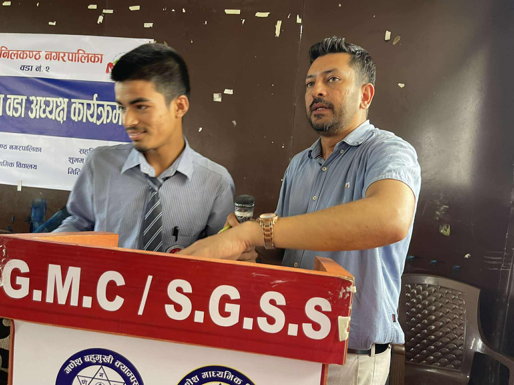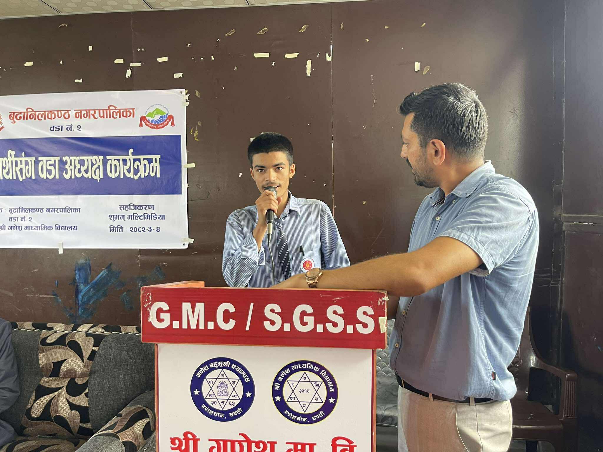 असार ४ गते बुधबार गणेश माध्यमिक विद्यालयको सभाहलमा १३० जना विद्यार्थीहरुको सहभागितामा कार्यक्रम सम्पन्न भएको हो । कार्यक्रम वडा अध्यक्ष राजेन्द्र श्रेष्ठको प्रमुख आतिथ्यमा स्कुलका प्रिन्सिपल मिमकाजि श्रेष्ठ को सभा अध्यक्षमा भएको कार्यक्रममा सहजकर्ता पत्रकार मुकुन्द ढुंगाना,समाजसेवी मिलन श्रेष्ठ , शिक्षक र विद्यार्थीको सहभागिता रहेको थियो ।