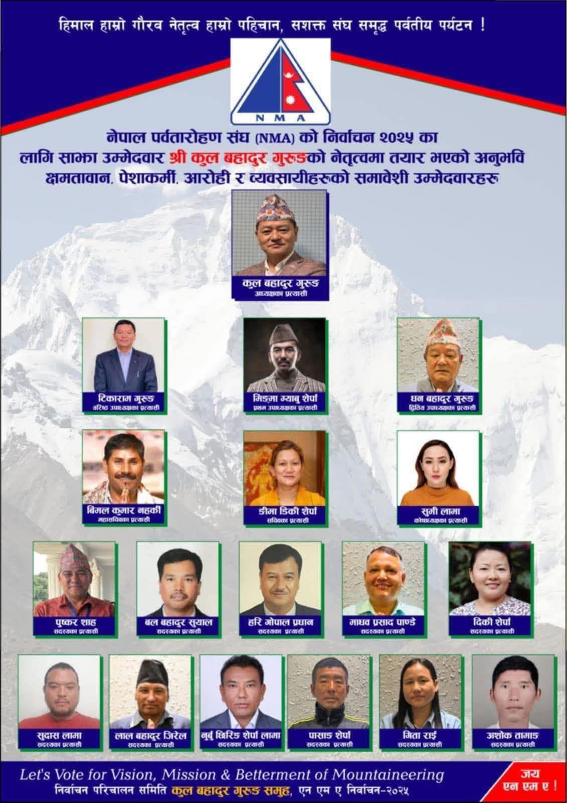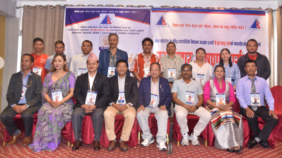 काठमाडौं। नेपाल पर्वतारोहण संघ (एनएमए) को भदौ ७ गते हुने निर्वाचन लागि अध्यक्ष पदका उम्मेदवार कुल बहादुर गुरुङ नेतृत्वको प्यानलको उम्मेदवारहरु तय गरी बिहिबार औपचारीक परिचय गरँइएको छ । गुरुङ नेतृत्वमा समावेशी उम्मेदवारहरु देखिएको छ । ‘हिमाल हाम्रो गौरव, नेतृत्व हाम्रो पहिचान, सशक्त संघ र दिगो पर्वतीय पर्यटन’ नाराका साथ एनएमए २०२५ का लागि गुरुङ नेतृत्वको उम्मेदवारहरुको घोषणा गरिएको हो ।