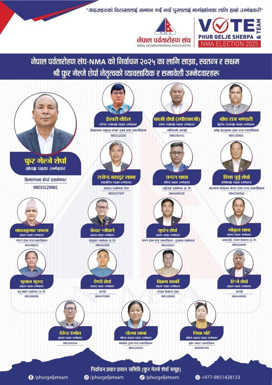काठमाडौं । नेपाल पर्वतारोहण संघ (एनएमए) को केन्द्रीय कार्यसमिति निर्वाचन-२०२५ का लागि अध्यक्ष पदका उम्मेदवार फुर गेल्जे शेर्पाको नेतृत्वमा बनेको समूहले शुक्रबार ३० बुँदे योजना सार्वजनिक गरेको छ। विश्व कीर्तिमानी आरोही, पर्वतारोहण व्यवसायी र पर्यटन विज्ञहरूलाई समेटेर बनेको यस समूहले संघलाई सुरक्षित, व्यवस्थित र अन्तर्राष्ट्रियस्तरको हिमालयन गन्तव्यका रूपमा स्थापित गर्ने लक्ष्य राखेको जनाएको छ।