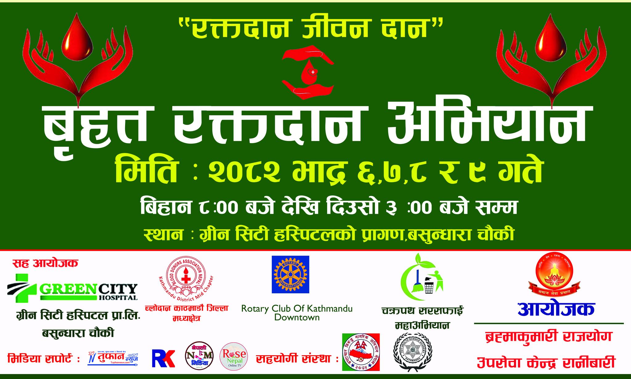 यसैबिच काठमाडौंको बसुन्धारा,चौकीमा रहेको ग्रीनसिटी हस्पिटल संगको सहकार्यमा ब्रह्माकुमारी राजयोग सेवाकेन्द्र रानीवारीको आयोजनामा यहि भाद्र ६,७,८ र ९ गते ग्रीनसिटी हस्पिटलको प्रागणमा बृहत रक्तदान कार्यक्रम संचालन भएको हो ।