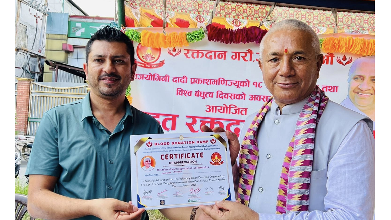 काठमाडौं । ब्रह्माकुमारी राजयोग नेपाल समाजसेवा प्रभागको आयोजनामा मेगा रक्तदान अभियान सन्चालन भएको छ ।