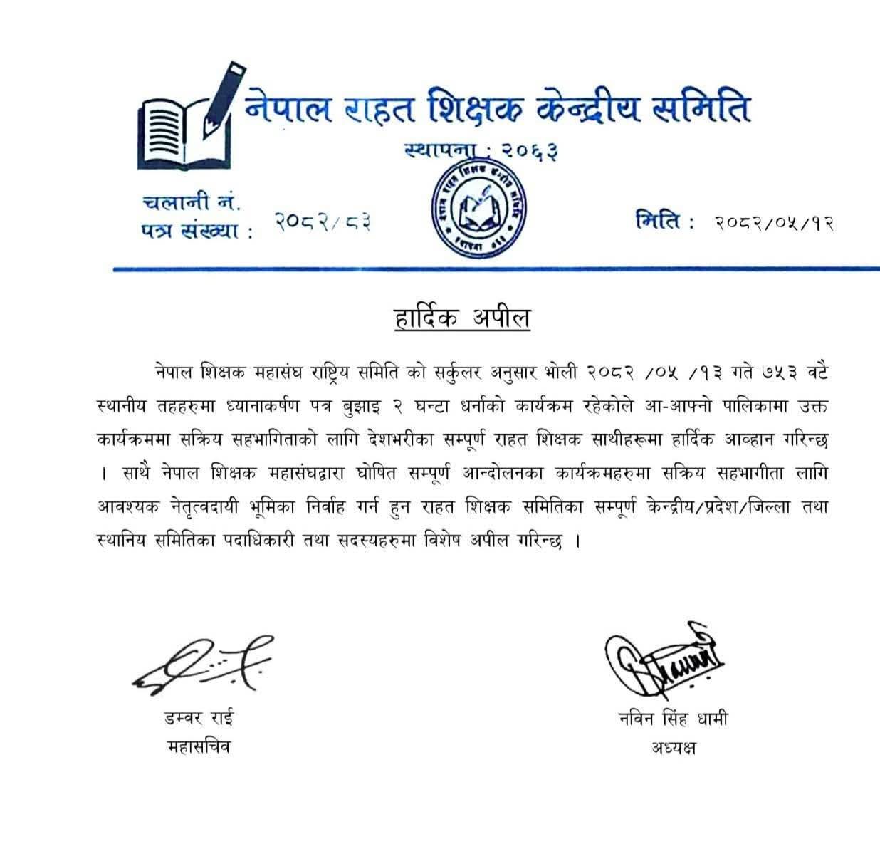 काठमाडौँ । विद्यालय शिक्षा विधेयकमा आफूसँगका सहमति कार्यन्वयन नगरिएको भन्दै आन्दोलनरत नेपाल शिक्षक महासंघले भदौ १३ गते स्थानीय तहमा धर्ना दिने भएको छ।