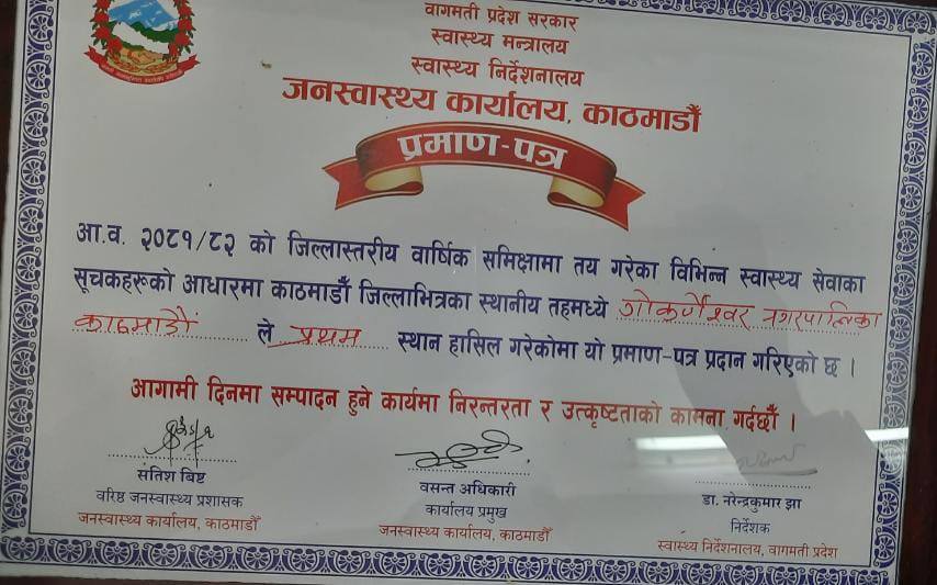 काठमाडौं । जनस्वास्थ्य कार्यालय काठमाडौंले आयोजना गरेको स्वास्थ्य सेवाको समीक्षाको आधारमा गोकर्णेश्वर नगरपालिकाले उत्कृष्ट सेवा प्रदान गरेको ठहर गरिएको छ। काठमाडौं जिल्लाका सबै स्थानीय तहबीचको मूल्याङ्कनमा गोकर्णेश्वर नगरपालिका प्रथम स्थान हासिल गर्न सफल भएको हो।