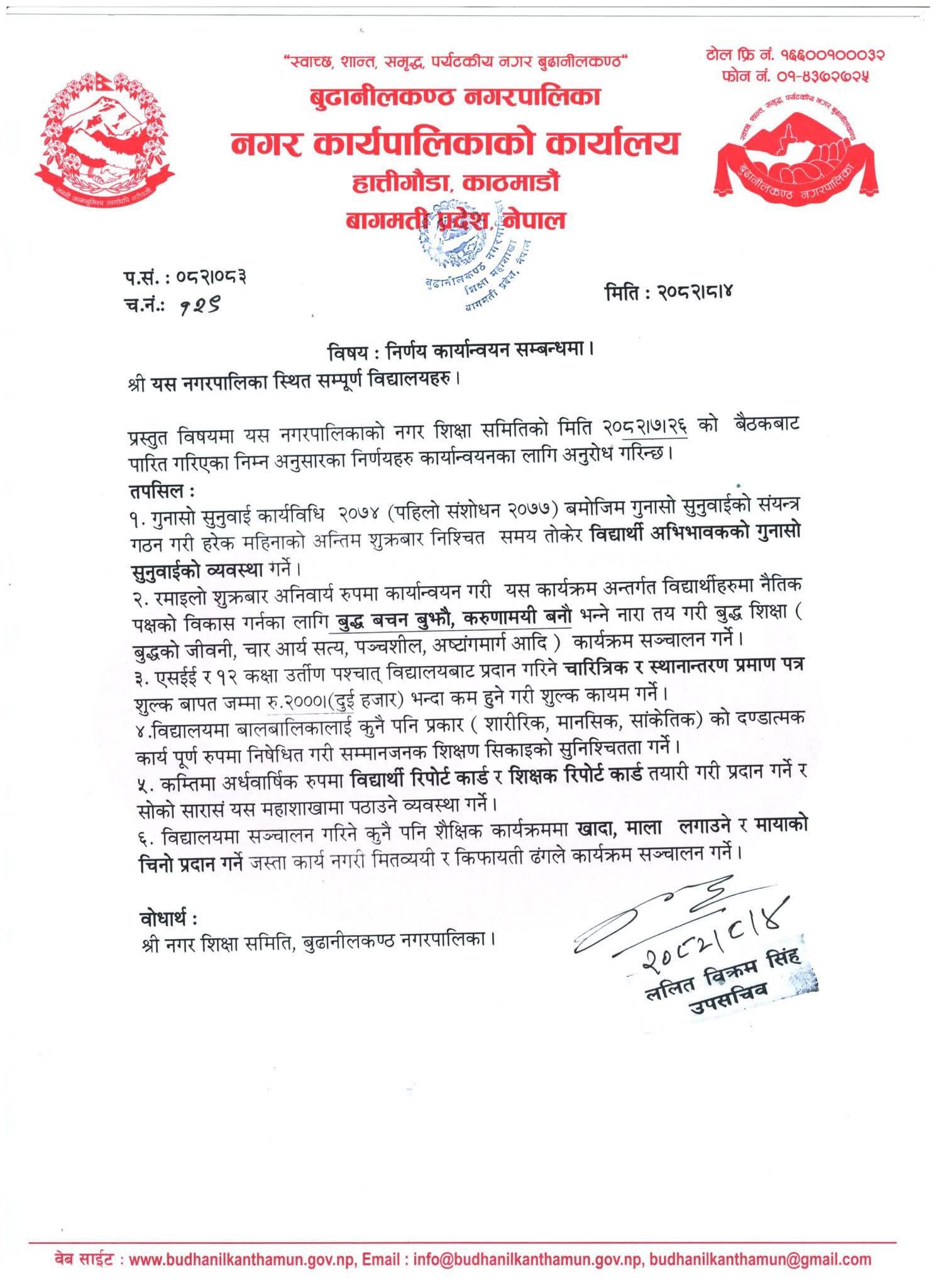 नगर शिक्षा समितिको मिति २०८१/०८/०६ को बैठकबाट पारित निर्णयअनुसार विद्यालय अभिभावक गुनासो व्यवस्थापनदेखि विद्यार्थीहरूको चरित्र विकास, शिक्षक प्रतिवेदन प्रणाली र विद्यालयमा धार्मिक कार्यहरूको रोकथामसम्मका विषय समेटिएका छन्।