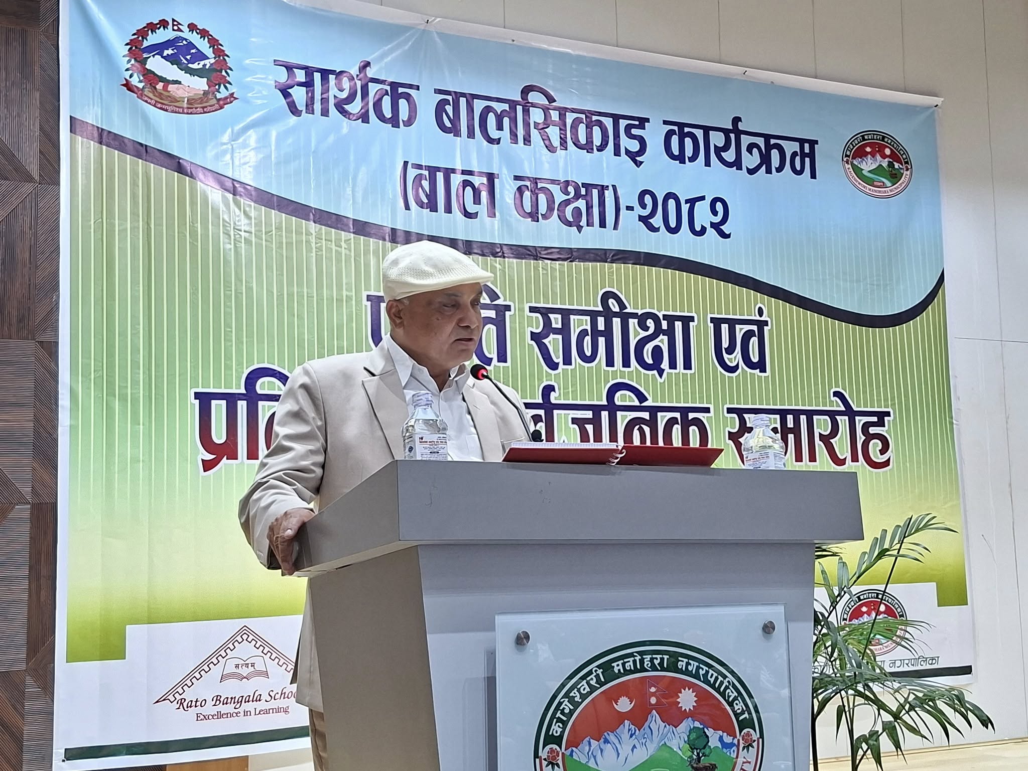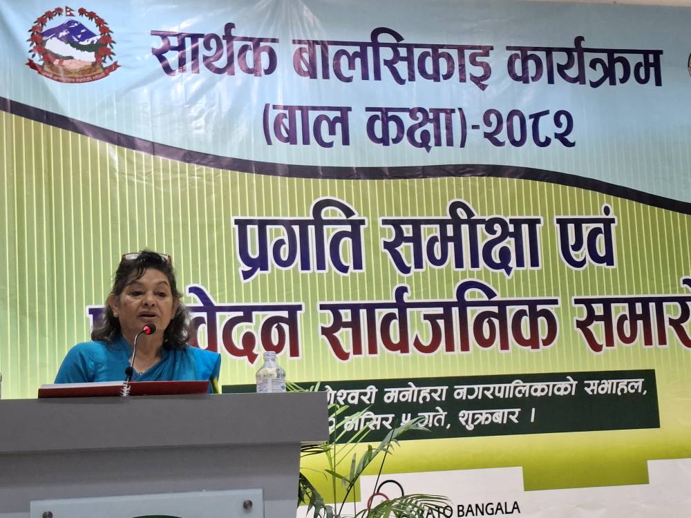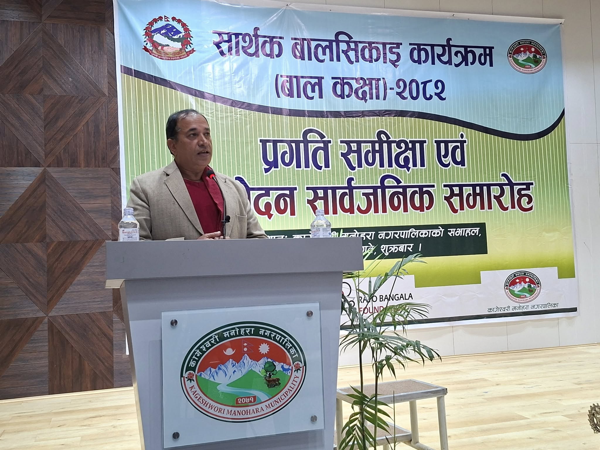 काठमाडौं। कागेश्वरी मनोहरा नगरपालिकामा सञ्चालन भइरहेको सार्थक बालसिकाइ कार्यक्रम (बाल कक्षा)–२०८२ अन्तर्गतको प्रगति समीक्षा तथा प्रतिवेदन सार्वजनिक कार्यक्रम शुक्रबार नगरपालिकाको सभाहलमा सम्पन्न भएको छ। कार्यक्रममा कार्यक्रमका उपलब्धि, चुनौती र आगामी कार्यदिशाबारे विस्तृत समीक्षा गरिएको साथै आधिकारिक प्रतिवेदन सार्वजनिक गरिएको हो।