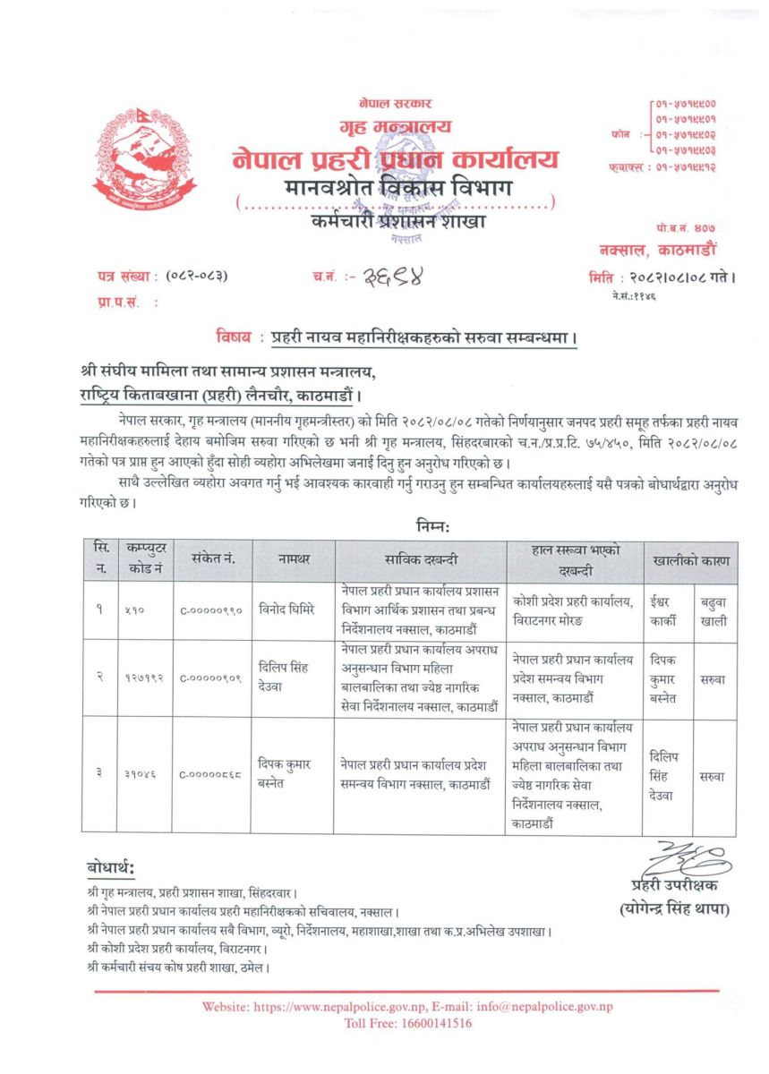 विनोद घिमिरे कोशी प्रदेश प्रहरी कार्यालयमा पदस्थापन भएका छन् । दिलिप सिंह देउवा प्रदेश समन्वय विभाग, नक्सालमा सरुवा भएका छन् भने त्यस्तै प्रधान कार्यालय अपराध अनुसन्धान विभाग महिला बालबालिका तथा जेष्ठ नागरिक सेवा निर्देशनालयमा दिपककुमार बस्नेतको सरूवा गरेको हो।
