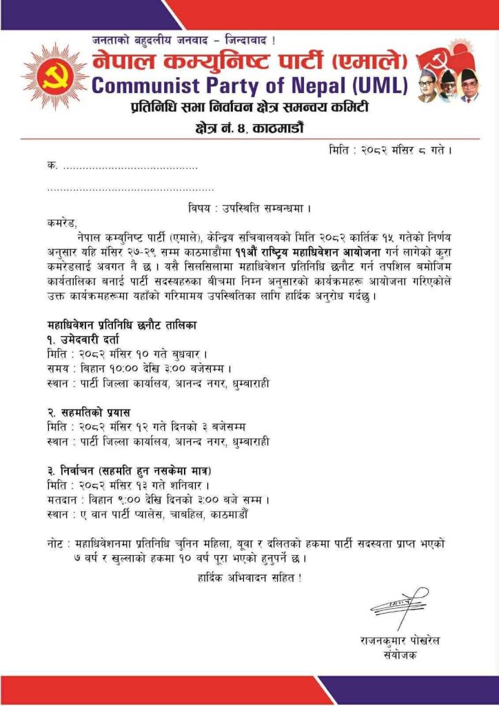 काठमाडौँ । नेकपा एमाले काठमाण्डौ क्षेत्र नं ४ ले महाधिवेशन प्रतिनिधि छनोट प्रक्रियालाई तीव्र बनाउँदै मनोनयन दर्ता कार्यतालिकालाई अन्तिम रूप दिएको छ। सुरुमा चाबहिल–गणेशस्थानस्थित क्षेत्रीय कार्यालयमा मनोनयन दर्ता गर्ने योजना रहे पनि स्थान अभावका कारण अब मनोनयन दर्ता नेकपा एमाले काठमाण्डौ जिल्ला कमिटीको कार्यालय (धोबीखोला कोरिडोर, ओम अस्पतालअगाडि) मा हुने भएको क्षेत्रीय संयोजक राजन कुमार पोखरेलले जानकारी दिए।