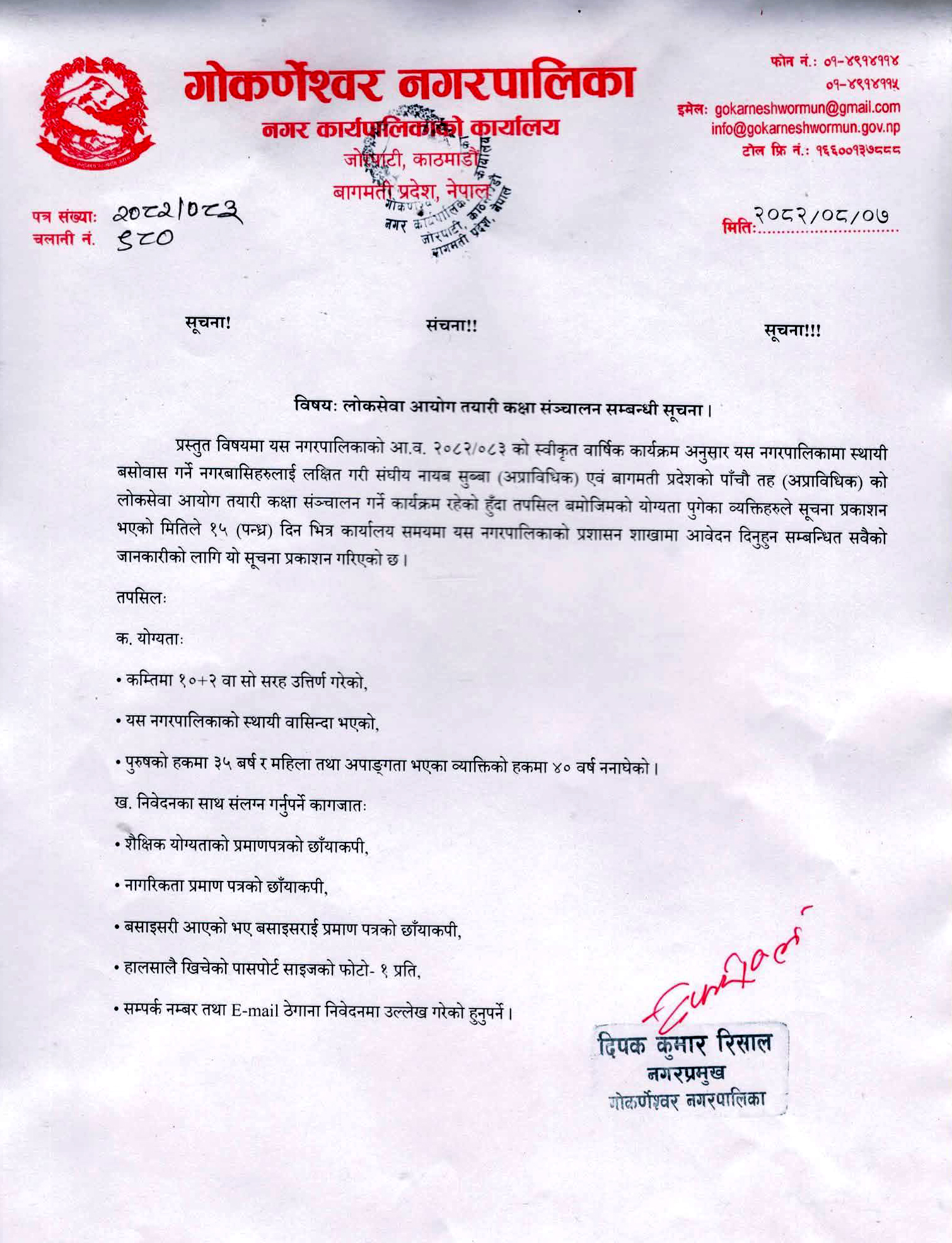 नगर प्रमुख दिपक रिसालले सार्वजनिक सूचना जारी गर्दै सबै योग्य र इच्छुक व्यक्तिहरूलाई सहभागिताको आग्रह गरेका छन्।