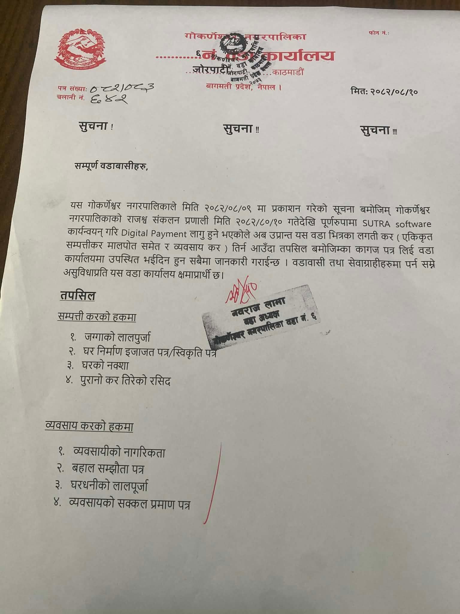 वडा–६ का वडा अध्यक्ष नवराज लामाका अनुसार हालैको जेन्जी आन्दोलनका क्रममा वडा कार्यालयका धेरै कागजात जलेर नष्ट भएको हुँदा कर सम्बन्धी पुराना रेकर्ड उपलब्ध छैनन्। त्यसैले एकपटकका लागि सबै सेवाग्राही तथा वडावासीले कर तिर्न आउँदा पूर्ण विवरणसहितका कागजात ल्याउनुपर्ने वडाले अनुरोध गरेको छ।