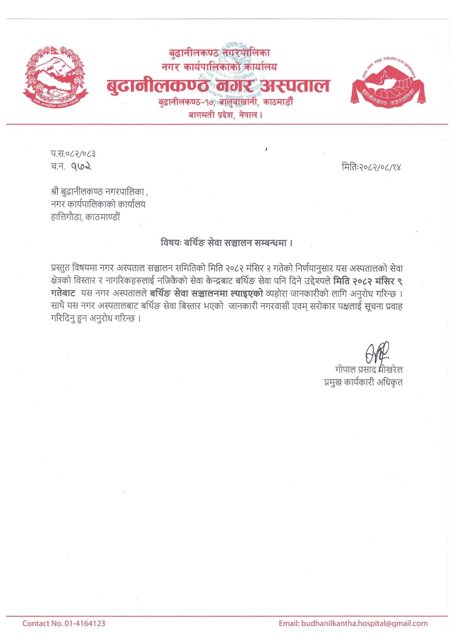 यसका लागि अस्पताल प्रशासनले बुढानीलकण्ठ नगरपालिकाको नगर कार्यपालिकाको कार्यालयलाई पत्र पठाउँदै बृद्ध सेवा विस्तारका सम्बन्धमा जानकारी गराएको छ । उक्त पत्रमा सेवाका विवरण तथा आवश्यक सहयोगका विषयमा समेत समन्वय गरिदिन अनुरोध गरिएको छ।