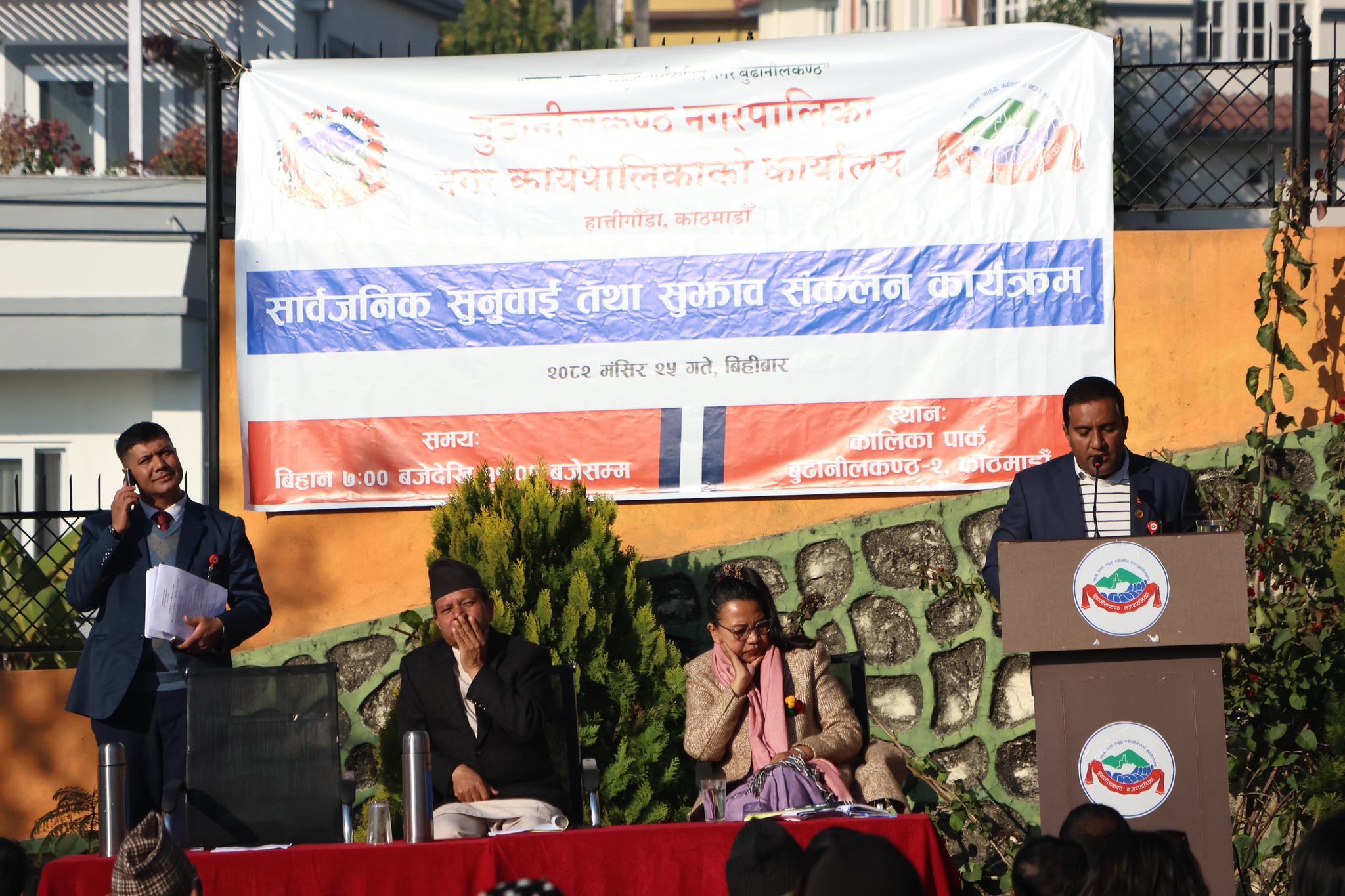 बुढानीलकण्ठ नगरपालिका–२, कालिका पार्कमा आयोजित सार्वजनिक सुनुवाइ तथा सुझाव संकलन कार्यक्रम सफलतापूर्वक सम्पन्न भएको छ। स्थानीय तहको सेवा प्रवाह, नागरिक सरोकार, पारदर्शिता र उत्तरदायित्व अभिवृद्धिका लागि प्रत्यक्ष संवादको माध्यमबाट कार्यक्रम सञ्चालन गरिएको हो। कार्यक्रममा स्थानीयवासीको उल्लेखनीय सहभागिता रह्यो।