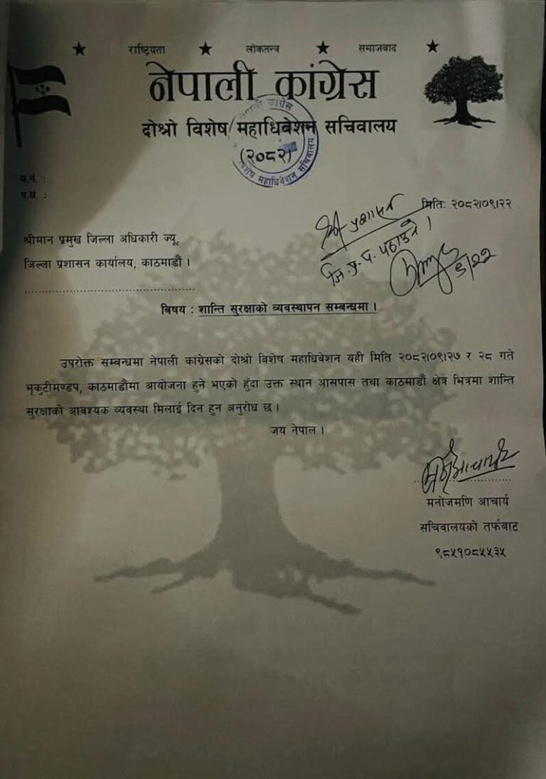 पत्रमा उल्लेख गरिएको छ, “नेपाली कांग्रेसको दोस्रो विशेष महाधिवेशन यही मिति २०८२ पुस २७ र २८ गते काठमाडौंको भृकुटीमण्डपमा आयोजना हुने भएकाले उक्त स्थान आसपास तथा काठमाडौं क्षेत्रभित्र शान्ति सुरक्षाको आवश्यक व्यवस्था मिलाइदिनुहुन अनुरोध छ।”