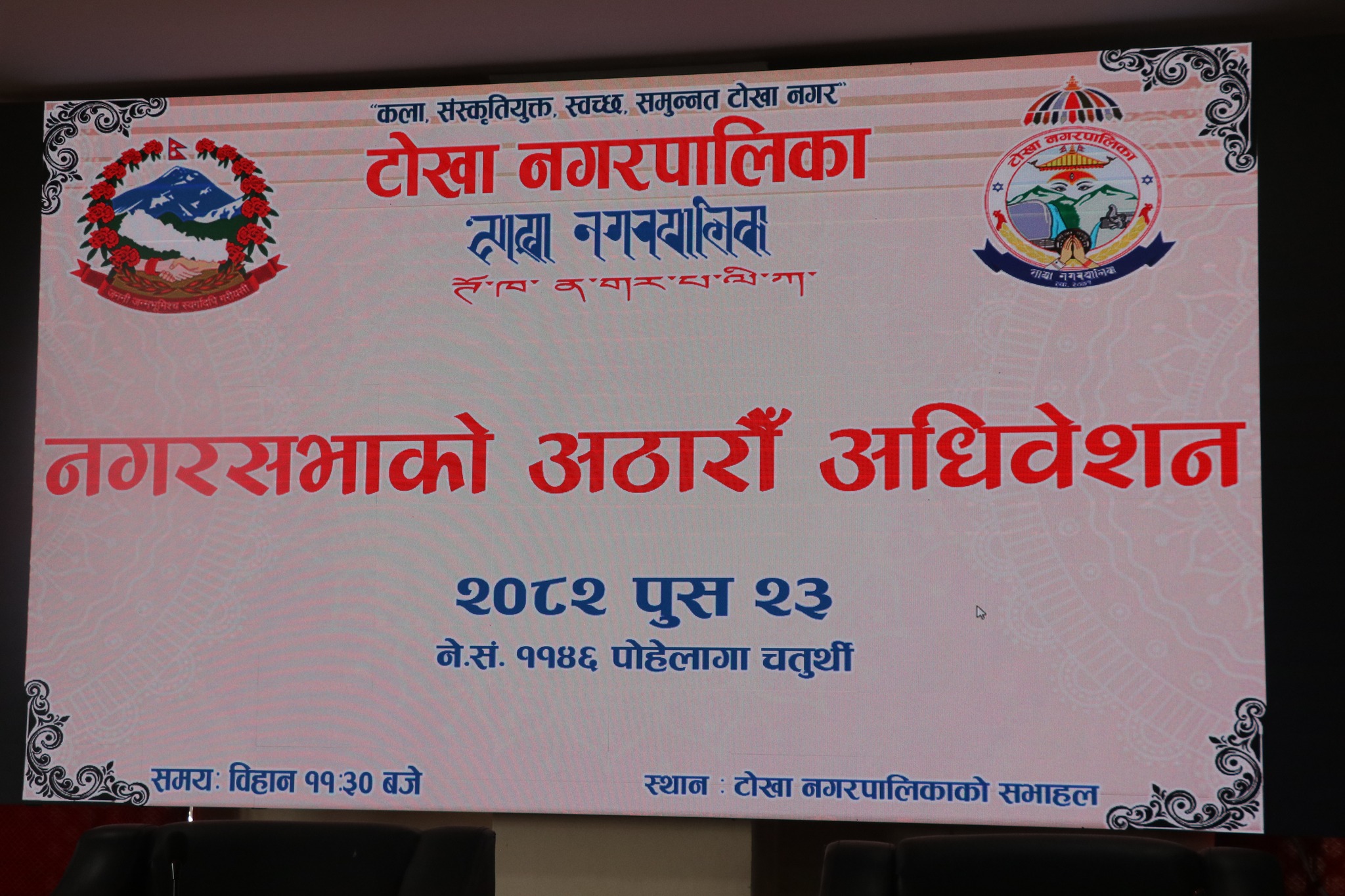 काठमाडौँ । टोखा नगरपालिकाको १८औँ नगर अधिवेशन नगर प्रमुख प्रकाश अधिकारीको अध्यक्षतामा भव्य र सौहार्दपूर्ण वातावरणमा सम्पन्न भएको छ । अधिवेशनमा प्रमुख प्रशासकीय अधिकृत, उप–नगर प्रमुख मुरारी तामाङ, वडाध्यक्षहरू, नगरसभा सदस्यहरू, नगर प्रहरी तथा नगरपालिकाका कर्मचारीहरूको उल्लेखनीय उपस्थिति रहेको थियो ।
