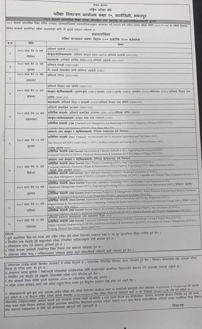 चैत २२ गते अनिवार्य गणित, २३ गते अनिवार्य विज्ञान, २४ गते सामाजिक अध्ययन, २५ गते ऐच्छिक प्रथम पत्र र २६ गते ऐच्छिक द्वितीय पत्रको परीक्षा हुनेछ।