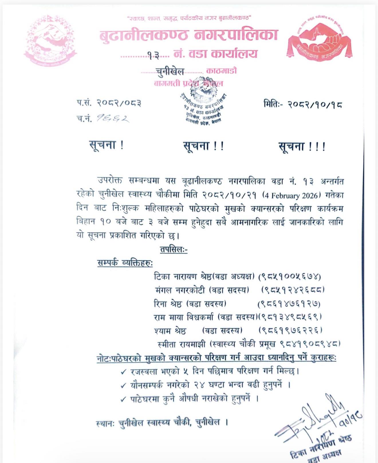 वडा कार्यालयका अनुसार मिति २०८२ माघ २१ गते (फेब्रुअरी ४, २०२६) का दिन बिहान १० बजेदेखि दिउँसो ३ बजेसम्म उक्त स्वास्थ्य परीक्षण कार्यक्रम आयोजना गरिनेछ । कार्यक्रम अन्तर्गत वडा नं. १३ भित्रका महिलाहरूले निःशुल्क रूपमा पाठेघरको मुखको क्यान्सर परीक्षण सेवा लिन सक्नेछन् ।