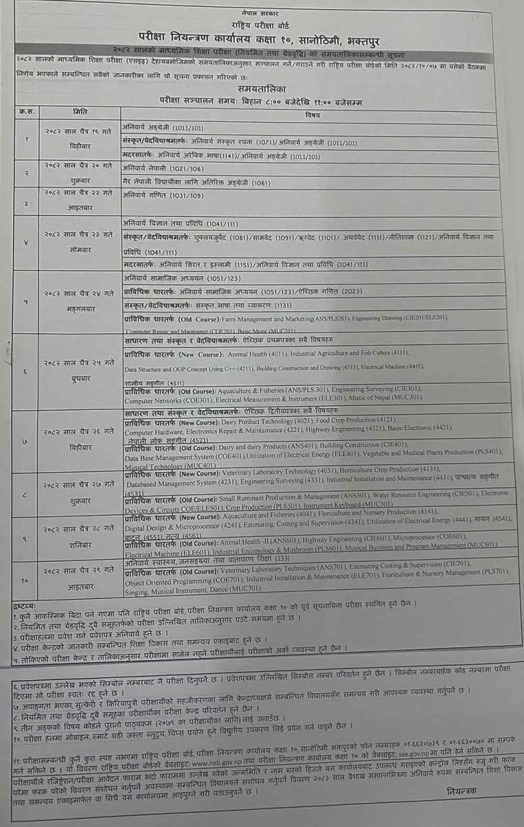 काठमाडौं । राष्ट्रिय परीक्षा बोर्डले माध्यमिक शिक्षा परीक्षा (एसईई) २०८२ को परीक्षा तालिका सार्वजनिक गरेको छ।